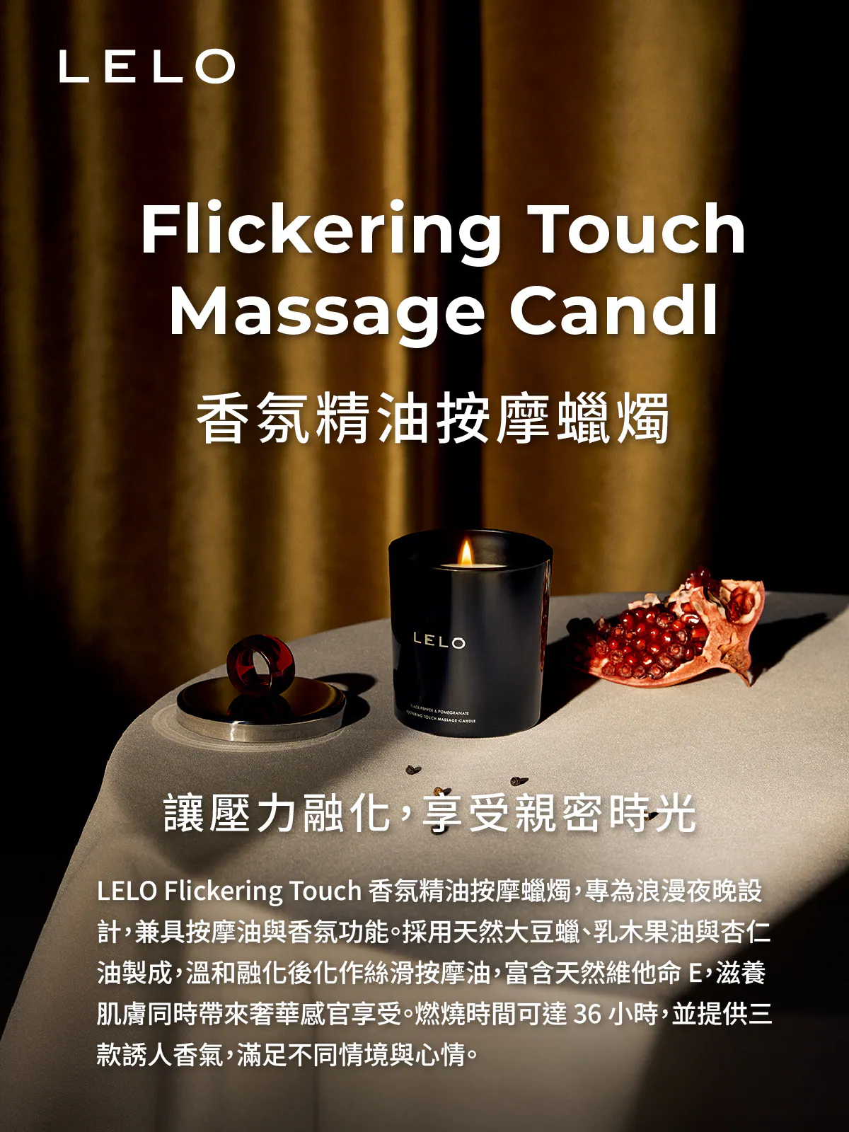 溫和融化後化作絲滑按摩油,富含天然維他命 E,滋養肌膚同時帶來奢華感官享受