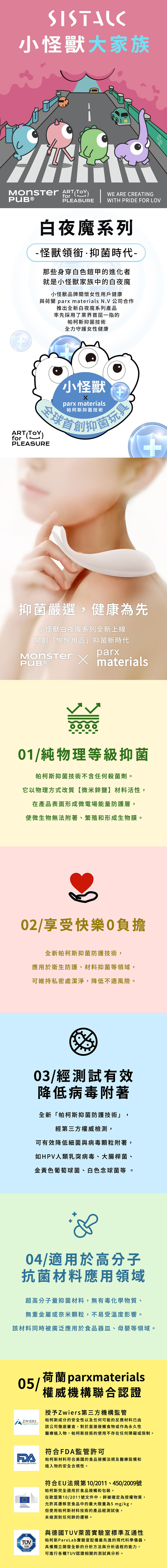 - 怪獸領銜 · 抑菌時代 -「那些身穿白色鎧甲的進化者,就是小怪獸家族中的白夜魔。」小怪獸品牌關懷女性用戶健康,與荷蘭 parx materials N.V 公司合作,推出全新白夜魔系列產品,率先採用了業界首屈一指的帕柯斯抑菌技術,全力守護女性健康。
